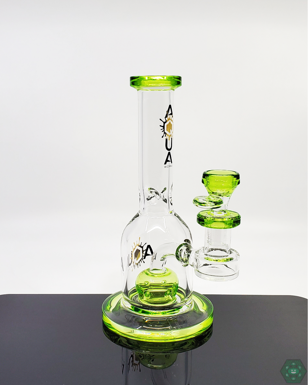 This 8-inch bell straight tube by Aqua Works Glass is designed for smooth, consistent hits with a sturdy build. Perfect for those seeking a reliable and compact water pipe.